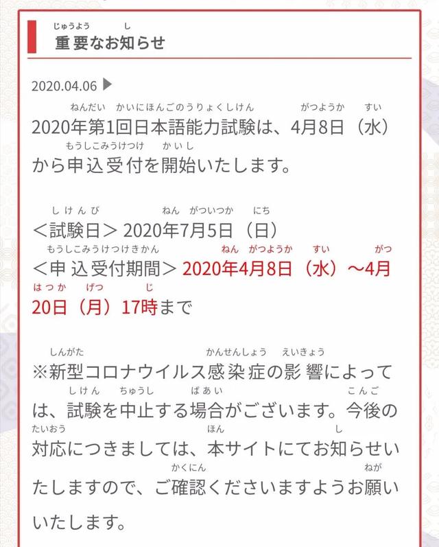 根据官网最新消息,2020年JLPT日本语能力考试将如期举行!