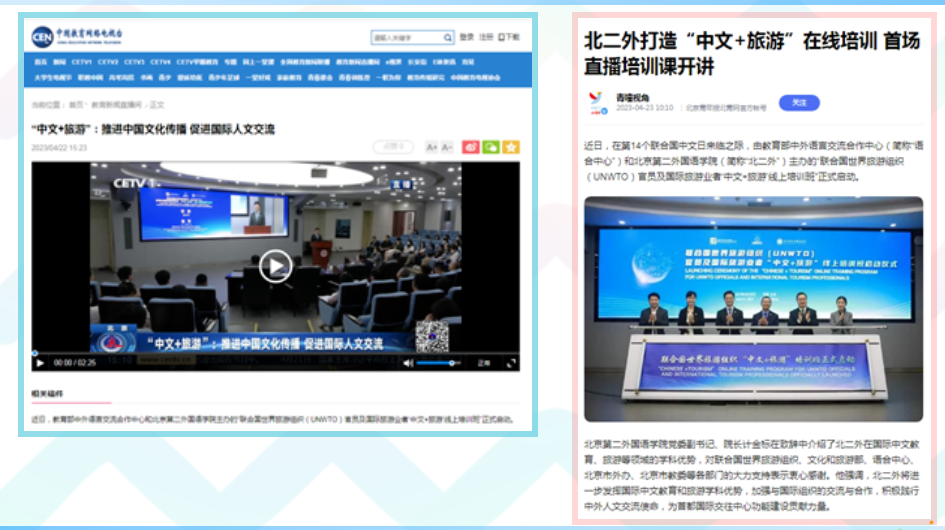 4月20日,联合国世界旅游组织(UNWTO)“中文+旅游”线上培训正式开班。此次培训主要面向UNWTO官员及国际旅游业者,旨在帮助其提高语言能力,提升旅游专业技能,促进国际中文教育和旅游业共同发展。中国教育网络电视台、北京青年报等媒体对此进行了报道。