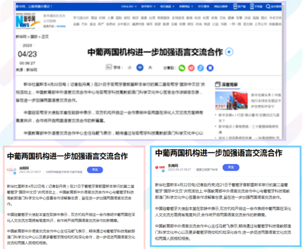 CGTN、人民网外文频道、ChinaDaily、美联社、彭博社等媒体以英语、西班牙语、法语、马来语等多语种发布报道,助力海外读者了解“国际中文日”。